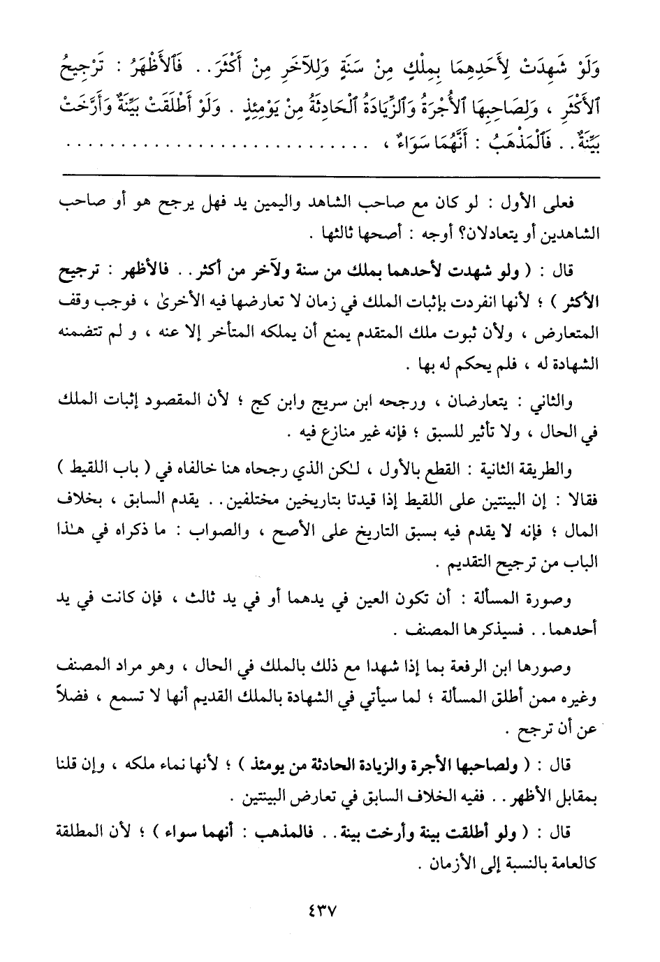 قال: (ولو شهدت لأحدهما بملك من سنة ولآخر من أكثر ... فالأظهر: ترجيح الأكثر)؛ لأنها انفردت بإثبات الملك في زمان لا تعارضها فيه الأخرى، فوجب وقف المتعارض، ولأن ثبوت ملك المتقدم يمنع أن يملكه المتأخر إلا عنه، ولم تتضمنه الشهادة له، فلم يحكم له بها.