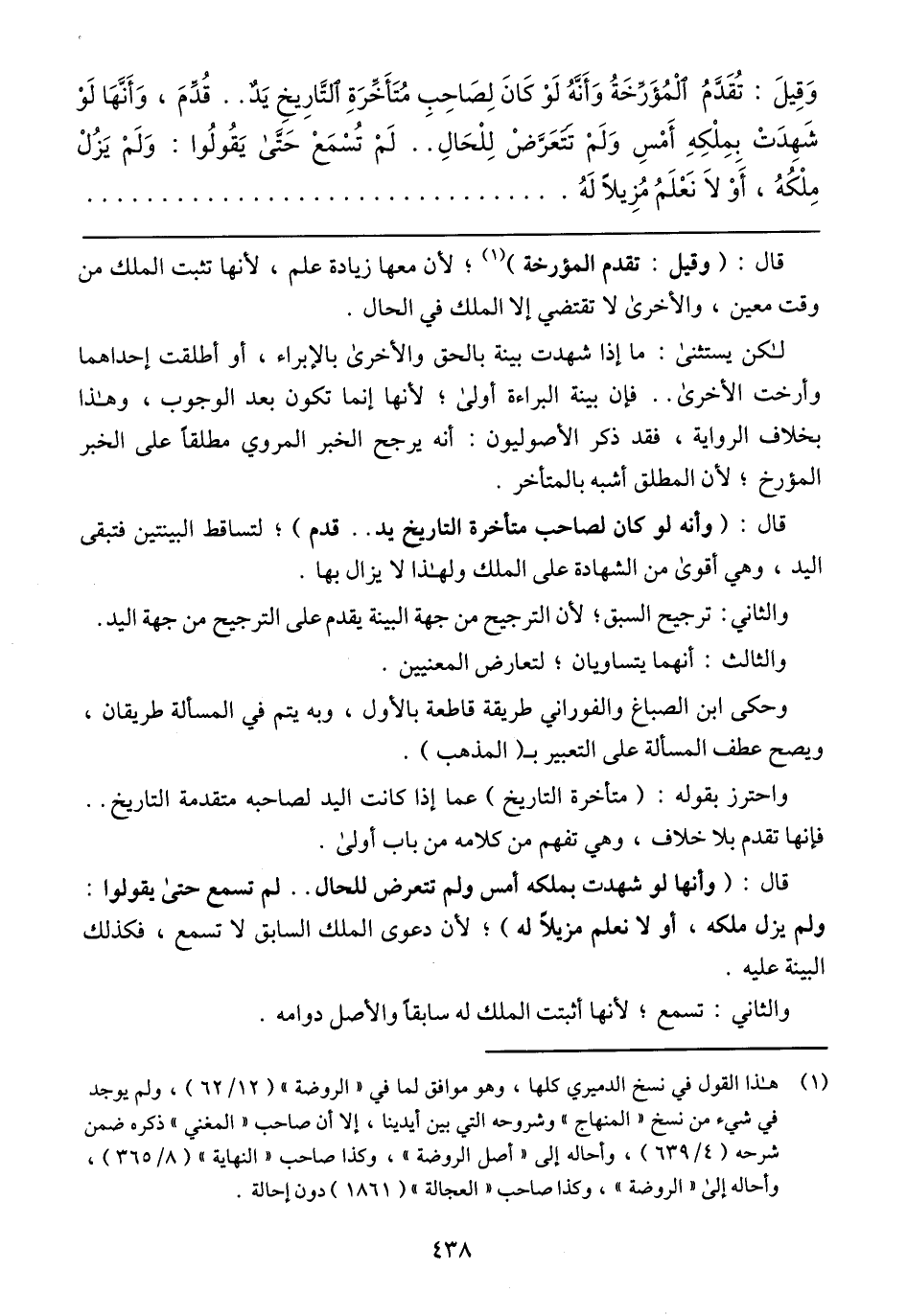 لكن يستثنى: ما إذا شهدت بينة بالحق والأخرى بالإبراء، أو أطلقت إحداهما وأرخت الأخرى ... فإن بينة البراءة أولى؛ لأنهما إنما تكون بعد الوجوب، وهذا بخلاف الرواية، فقد ذكر الأصوليون: أنه يرجح الخبر المروي مطلقًا على الخبر المؤرخ؛ لأن المطلق أشبه بالمتأخر.