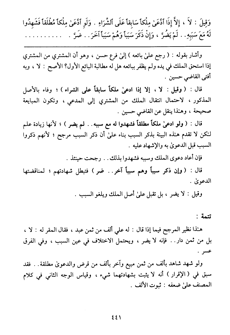 وقيل: لا، إلا إذا ادعى ملكا سابقا على الشراء. ولو ادعى ملكا مطلقا فشهدوا له مع سببه ... لم يضر، وإن ذكر سببا وهم سببا آخر ... ضر ...