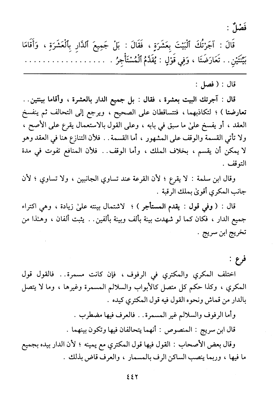 قال: (فصل: قال: آجرتك البيت بعشرة، فقال: بل جميع الدار بالعشرة، وأقاما بينتين ... تعارضتا)؛ لتكاذبهما، فتتساقطان على الصحيح، ويرجع إلى التحالف ثم ينفسخ العقد، أو يفسخ على ما سبق في بابه، وعلى القول بالاستعمال يقرع على الأصح، ولا تأتي القسمة والوقف على المشهور، أما القسمة ... فلأن التنازع هنا في العقد وهو لا يمكن أن يقسم، بخلاف الملك، وأما الوقف ... فلأن المنافع تفوت في مدة التوقف.