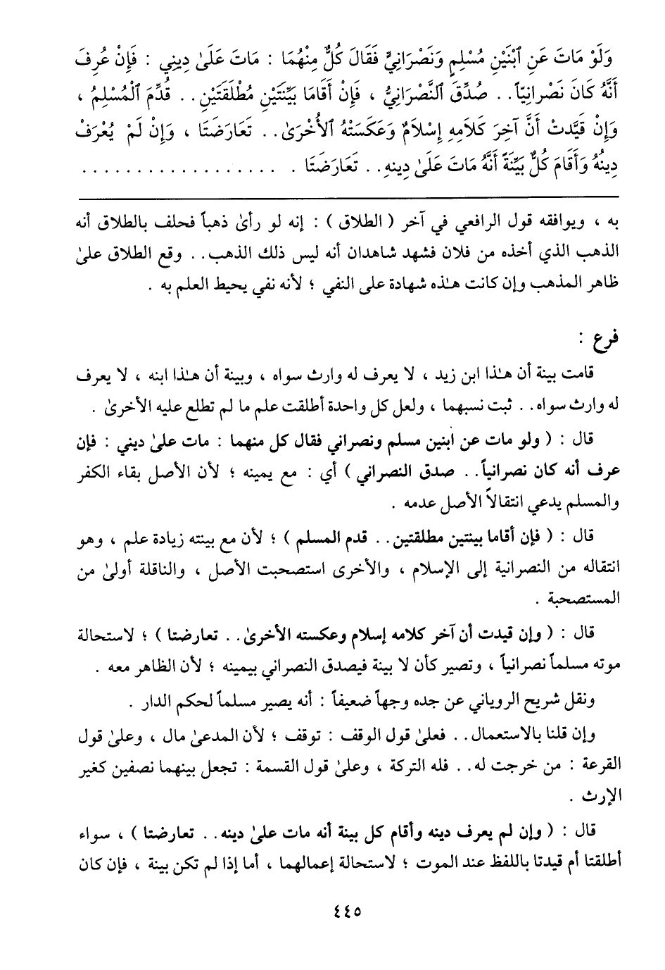 قال: (ولو مات عن ابنين مسلم ونصراني فقال كل منهما: مات على ديني: فإن عرف أنه كان نصرانيًا ... صدق النصراني) أي: مع يمينه؛ لأن الأصل بقاء الكفر والمسلم يدعي النتقالًا الأصل عدمه.