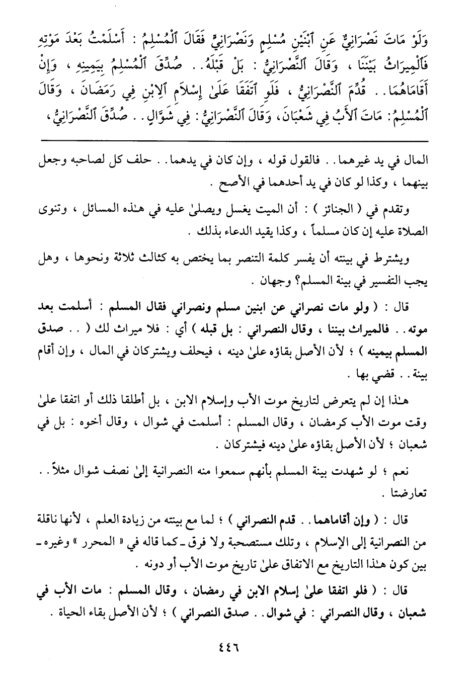 قال: (ولو مات نصراني عن ابنين مسلم ونصراني فقال المسلم: أسلمت بعد موته .. فالميراث بيننا، وقال النصراني: بل قبله) أي: فلا ميراث لك (.. صدق المسلم بيمينه)؛ لأن الأصل بقاؤه على دينه، فيحلف ويشتركان في المال، وإن أقام بينة .. قضي بها.