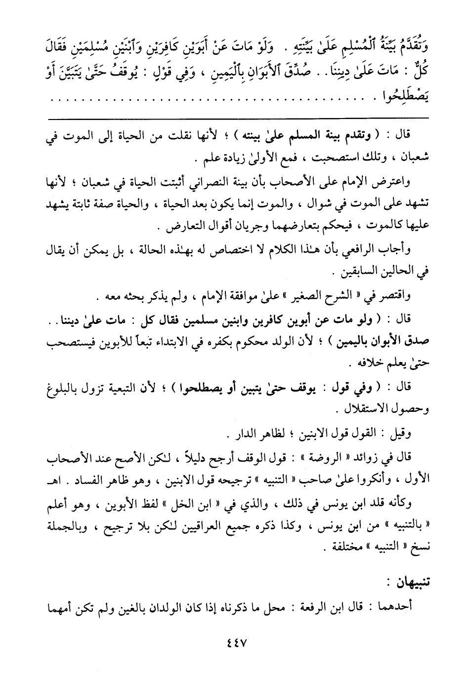 وَتُقَدَّمُ بَيِّنَةُ المُسلِمِ عَلَى بَيَّنَتِهِ. وَلَو مَاتَ عَن أَبَوَينِ كَافِرَينِ وَابنَينِ مُمسلِمَينِ فَقَالَ كُلُّ: مَاتَ عَلَى دِينِنَا .. صُدِّقَ الَأَبَوَانِ بِاليَمِينِ, وَفِي قَولٍ: يُوقَفُ حَتَّى يَتَبَيَّنَ أَو يَصطَلِحُوا