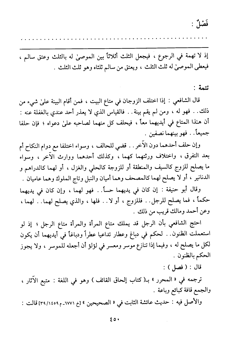 وإن حلف أحدهما دون الآخر .. قضي للحالف, وسواء اختلفا مع دوام النكاح أم بعد التفرق, واختلاف مرثتهما كهما, وكذلك أحدهما ووارث الآخر, وسواء ما يصلح للزوج كالسيف والمنكقة أو للزوجة كالحلي والغزل, أو لهما كالدرهم والدنانير, أو ملا يصلح لهما كالمصحف وهما أميان والنبل وتاج الملوك وهما عاميان.