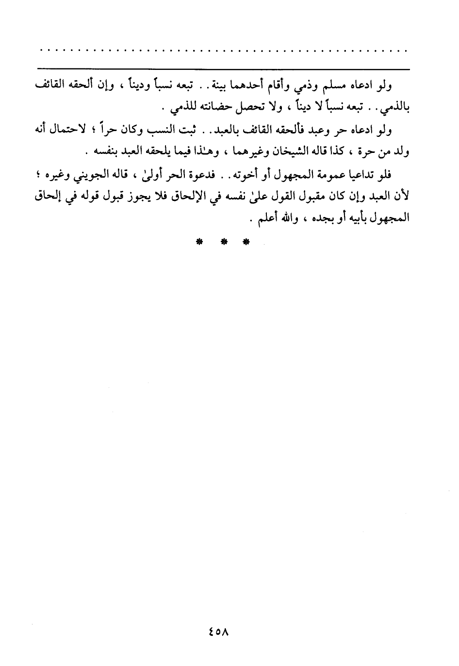فلو تداعيا عمومة المجهول أو أخوته .. فدعوة الحر أولى, قاله الجويني وغيره؛ لأن العبد وإن كان مقبول القول على نفسه في الإلحاق فلا يجوز قبول قوله في إلحاق المجهول بأبيه أو بجده, والله أعلم.