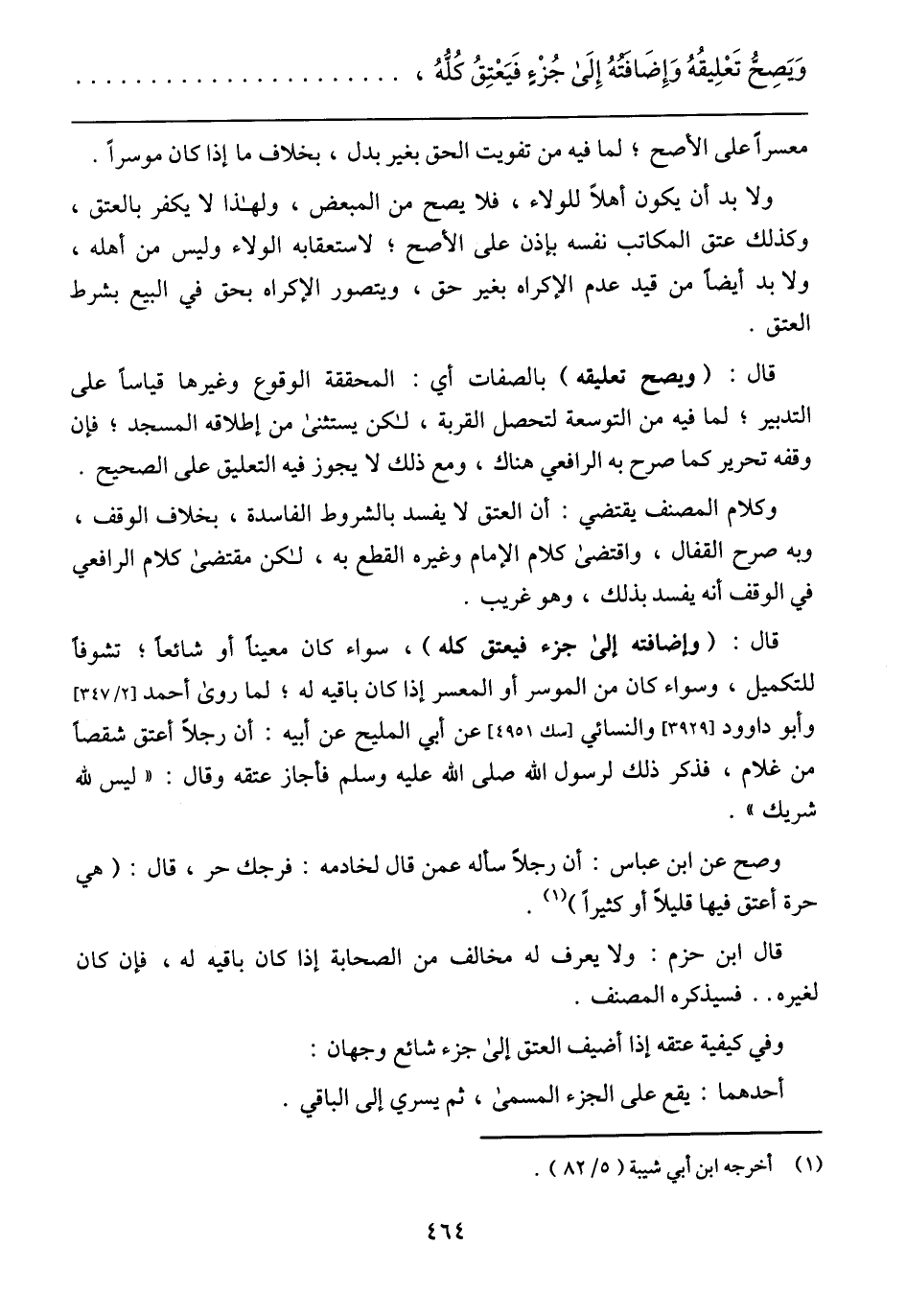 قال: (وإضافته إلى جزء فيعتق كله) , سواء كان معنيًا أو شائعًا؛ تشوفًا للتكميل, وسواء كان من الموسر أو المعسر إذا كان باقية له؛ لما روى أحمد [2/ 347] وأبو داوود /3929] والنسائي [سك 4951] عن أبي المليح عن أبيه: لأن رجلاظص أعتق شقصًا من غلام, فذكر ذلك لرسول الله صلى الله عليه وسلم فأجاز عتقه وقال: (ليس لله شريك).