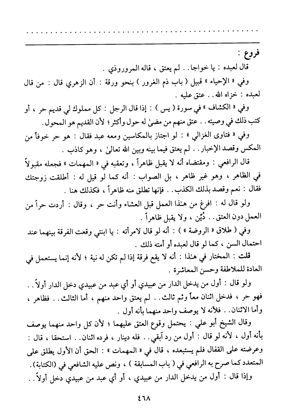 وفي (فتاوى الغزالي): لو اجتاز بالمكاسين ومعه عبد فقال: هو حر خوفًا من المكس وقصد الإخبار .. لم يعتق فيما بينه وبين الله تعالى, وهو كاذب.