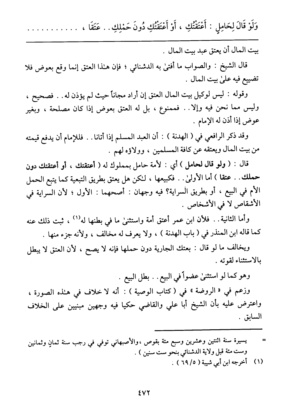 قال الشيخ: والصواب ما أفتى به الدشنائي؛ فإن هذا العتق إنما وقع بعوض فلا تضييع فيه على بيت المال.
