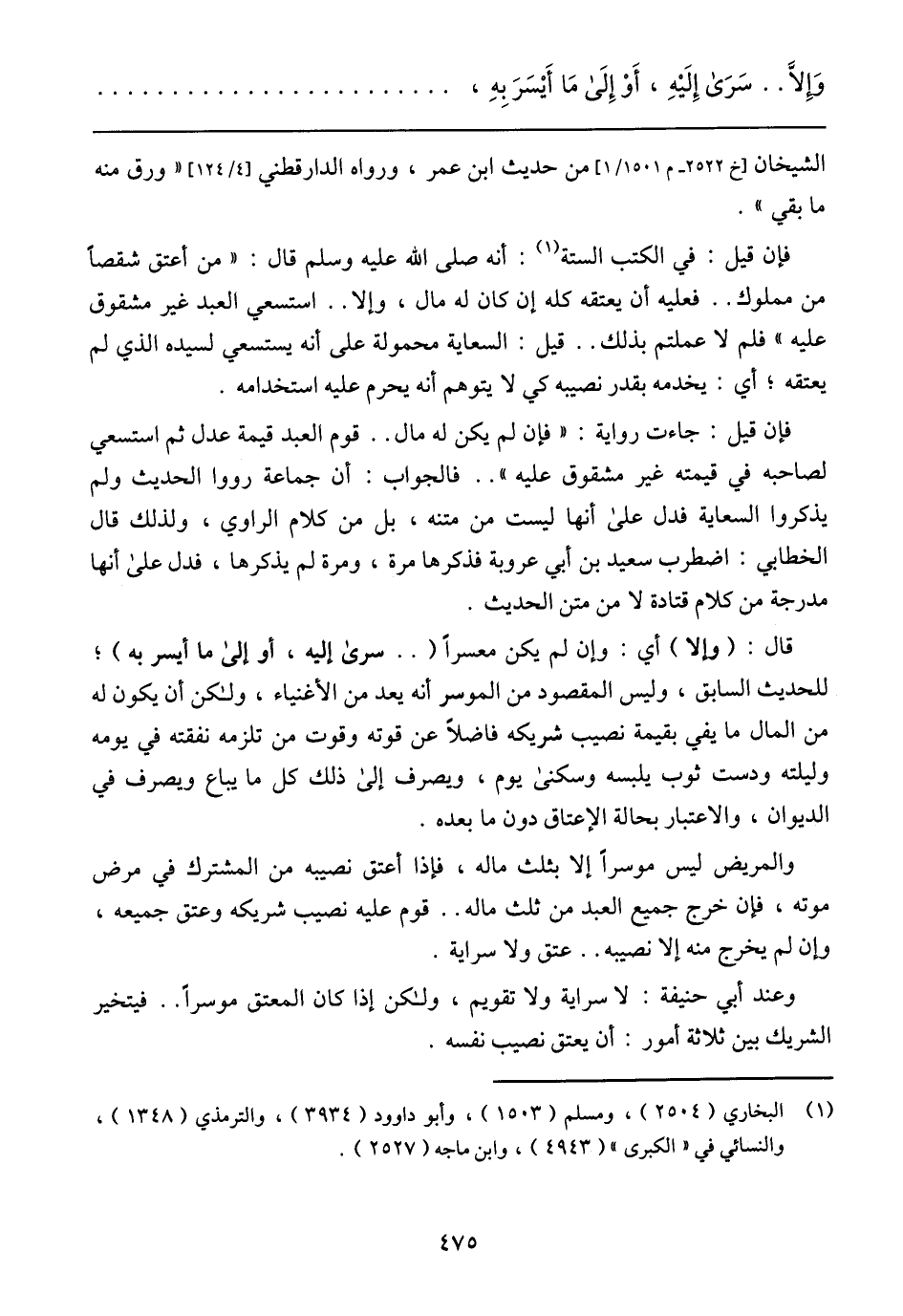فإن قيل: جاءت رواية: (فإن لم يكن له مال .. قوم العبد قيمة عدل ثم استسعى لصاحبه في قيمته غير مشقوق عليه) .. فالجواب: أن جماعة رووا الحديث ولم يذكروا السعاية فدل على أنها ليست من متنه, بل من كلام الراوي, ولذلك قال الخطابي: اضطرب سعيد بن أبي عروبة فذكرها مرة, ومرة لم يذكرها, فدل على أنها مدرجة من كلام قتادة لا من متن الحديث.