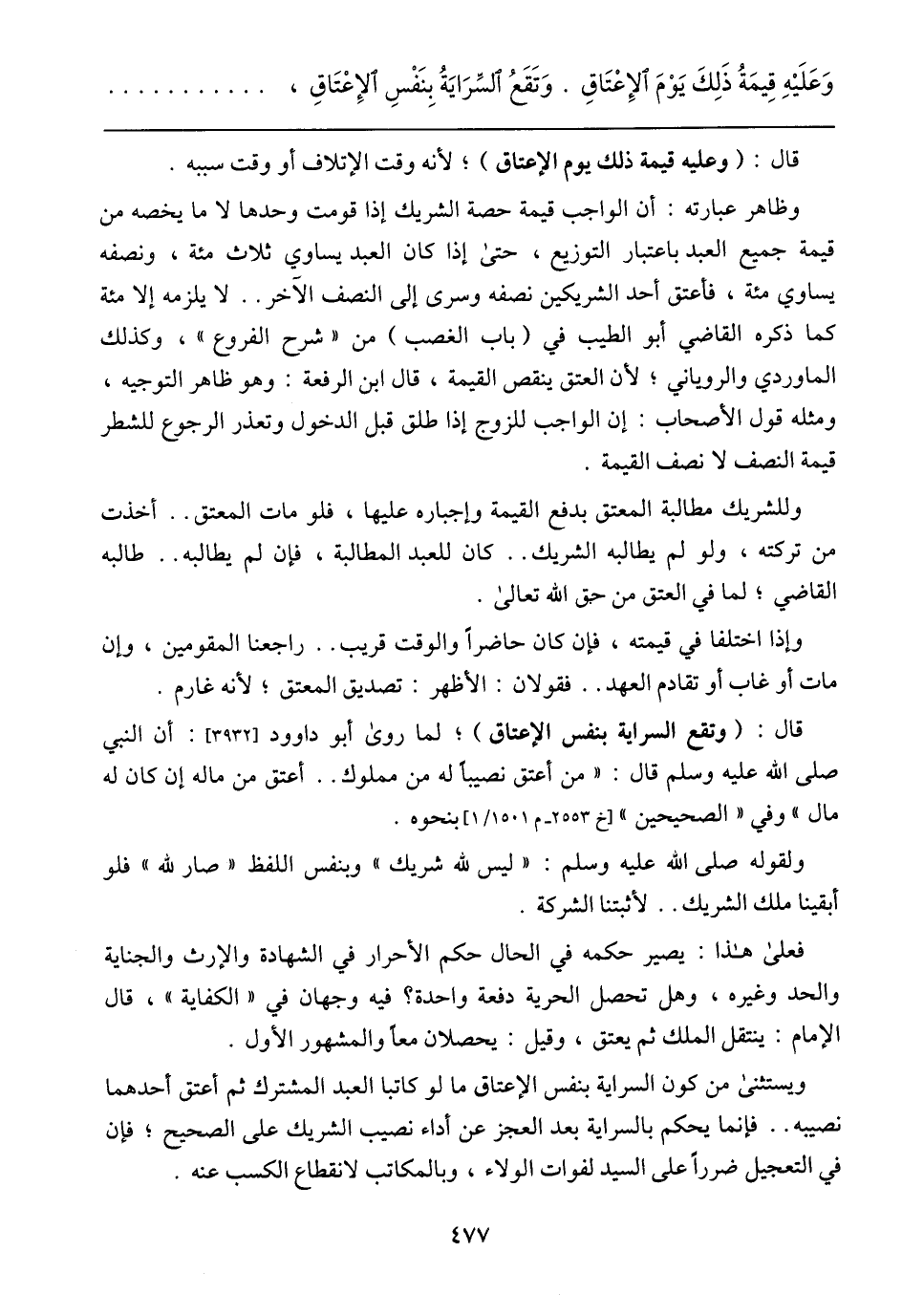 قال: (وتقع السراية بنفس الإعتاق)؛ لما روى أبو داوود [3932]: أن النبي صلى الله عليه وسلم قال: (من أعتق نصيبًا له من مملوك .. أعتق من ماله إن كان له مال) وفي (الصحيحين) [خ 2553_ م 1501/ 1] بنحوه.
