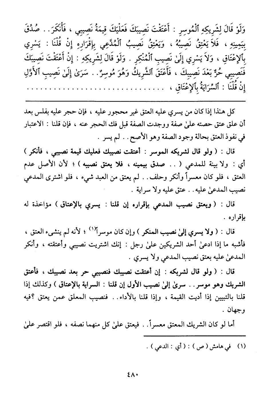 وَلَو قَالَ لِشَريكِهِ المُوسِرِ: أَعتَقتَ نَصِيبَكَ فَعَليكَ قِيمَةُ نَصِيِبي, فَأنكَرَ .. صُدِّقَ بِيَمِينِهِ, فَلاَ يَعتِقُ نَصِيبُهُ, وَيَعتِقُ نَصِيبُ المُدَّعِي بِإقرَارِهِ إِن قُلنَا: يَسرِي بِالِإعتَاقِ, ولاَ يَسرِي إلَى نَصِيبِ المُنكِرِ. وَلَو قَالَ لِشَرِيكِه: إن أَعتَقَ نَصِيبَكَ فَنَصيِبي حُرٌّ بَعدَ نَصِيبِكَ, فَأعتَقَ الشَّرِيكُ وَهُوَ مُوسِرٌ .. سَرَى إلَى نَصِيبِ الأَوَّلِ إن قُلنَا: السِّرَايَةُ بِالِإعتَاقِ,
