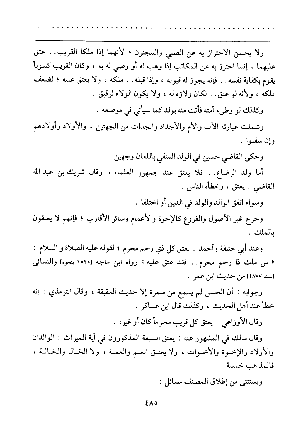 وقال مالك في المشهور عنه: يعتق السبعة المذكورون في آية الميراث: الوالدان والأولاد والإخوة والأخوات, ولا يعتق العم والعمة, ولا الخال والخالة, فالمذاهب خمسة.