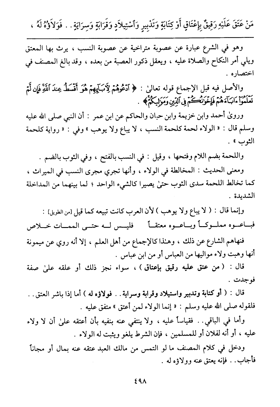 مَن عَتَقَ عَلَيهِ رَقِيقٌ أَو كِتَابَةٍ وَتَدبِيرٍ وَاستِيلاَدٍ وَقَرَابَةٍ وسِرَايَةٍ .. فَوَلاؤُهُ لَهُ,