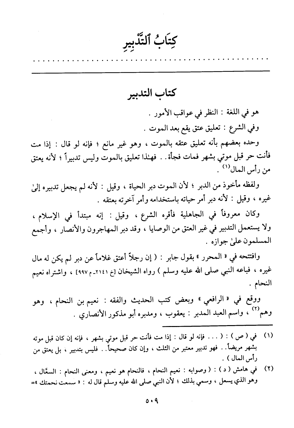 وافتتحه في (المحرر) بقول جابر: (إن رجلًا أعتق غلامًا عن دبر لم يكن له مال غيره، فباعه النبي صلى الله عليه وسلم) رواه الشيخان [خ 2141 - م997]، واشتراه نعيم النحام.