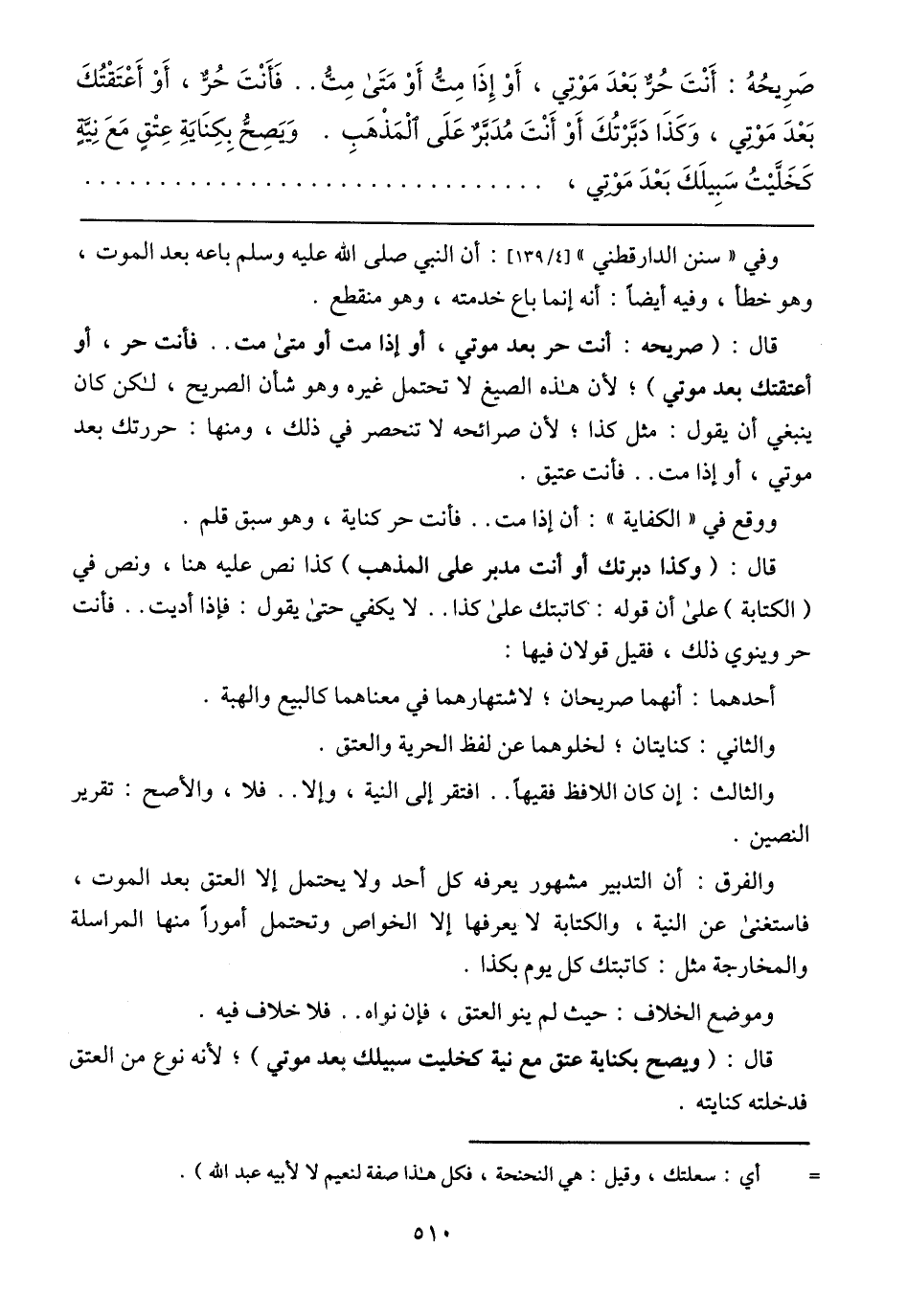صَرِيحُهُ: أَنْتَ حُرٌّ بَعْدَ مَوْتِي، أَوْ إِذَا مِتُّ أَوْ مَتَى مِتُ .. فَأَنْتَ حُرٌّ، أَوْ أَعْتَقْتُكَ بَعْدَ مَوْتِي، وَكَذَا دَبَّرْتُكَ أَوْ أَنْتَ مُدَبَّرٌ عَلَى الْمَذْهَبِ. وَيَصِحُّ بِكِنَايَةِ عِتْقٍ مَعَ نِيَّةٍ كَخَلَّيْتُ سَبِيلَكَ بَعْدَ مَوْتِي،