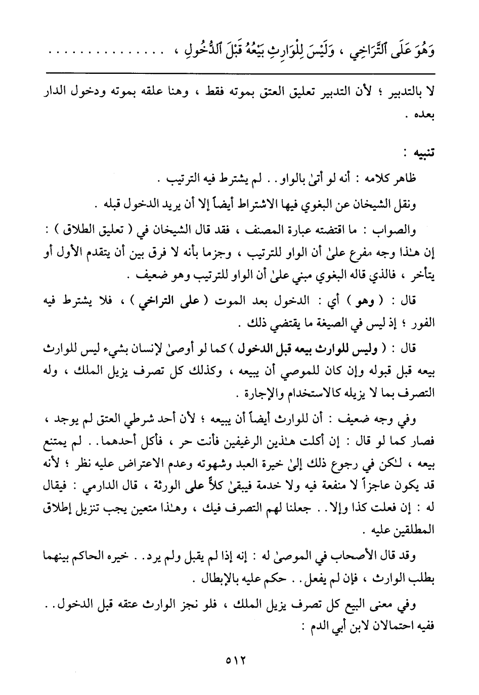 وفي وجه ضعيف: أن للوارث أيضًا أن يبيعه؛ لأن أحد شرطي العتق لم يوجد فصار كما لو قال: إذ أكلت هذين الرغيفين فأنت حر، فأكل أحدهما .. لم يمتنع بيعة، لكن في رجوع ذلك إلى خيرة العبد وشهوته وعدم الاعتراض عليه نظر؛ لأنه قد يكون عاجزًا لا منفعة فيه ولا خدمة فيبقى كلًا على الورثة، قال الدارمي: فيقال له: إن فعلت كذا وإلا .. جعلنا لهم التصرف فيك، وهذا متعين يجب تنزيل إطلاق المطلقين عليه.