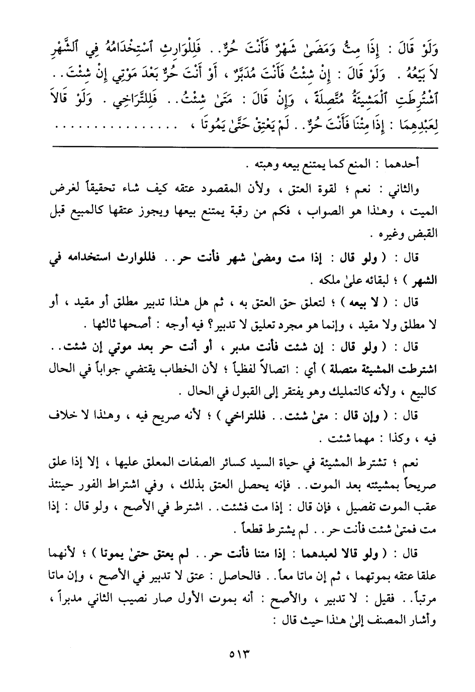 وَلَوْ قَالَ: إِذَا مِتُّ وَمَضَى شَهْرٌ فَأَنْتَ حُرٌّ .. فَلِلْوَارِثِ اسْتِخْدَامُهُ فِي الشَّهْرِ لاَ بَيْعُهُ. وَلَوْ قَالَ: إِنْ شِئْتُ فَأَنْتً مُدَبَّرٌ، أَوْ أَنْتَ حُرٌّ بَعْدَ مَوْتِي إِنْ شِئْتً .. اشْتُرِطَتِ الْمَشِيئَةُ مُتَّصِلَةَ، وَإِنْ قَالَ: مَتَى شِئْتُ .. فَلِلتَّراَخِي. وَلَوْ قَالاَ لِعَبْدِهمَا: إِذًا مِتْنَا فَأَنْتَ حُرٌّ .. لَمْ يَعْتِقْ حَتَّى يَمُوتًا،