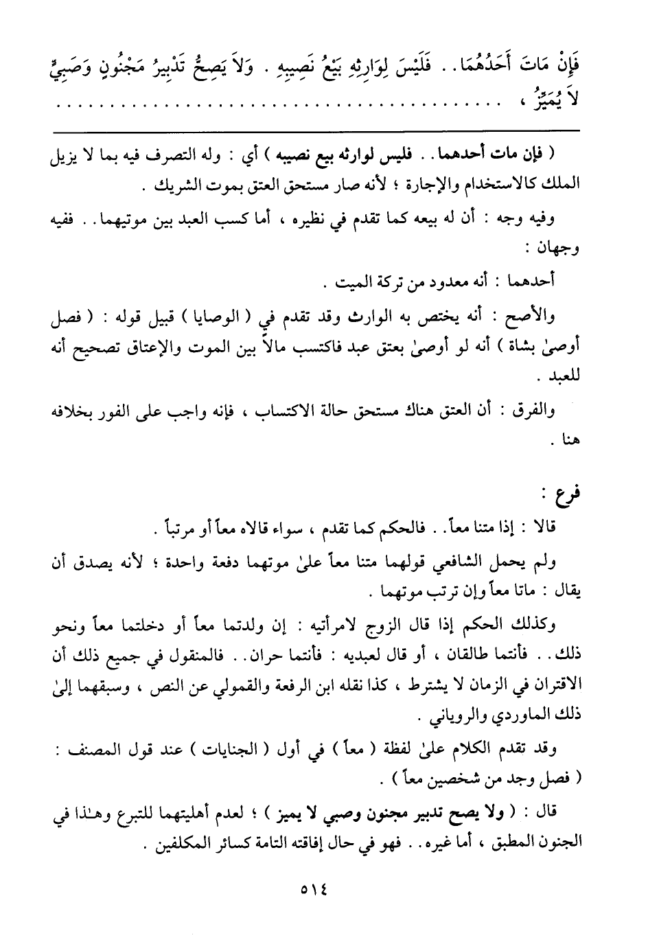 فَإِنْ مَاتَ أَحَدُهُمَا .. فَلَيْسَ لِوَارِثِهِ بَيْعُ نَصِيِبِه. وَلاَ يَصحُّ تَدْبِيرُ مَجْنُونٍ وَصَبِيٍّ لاَ يُمَيِّزُ،