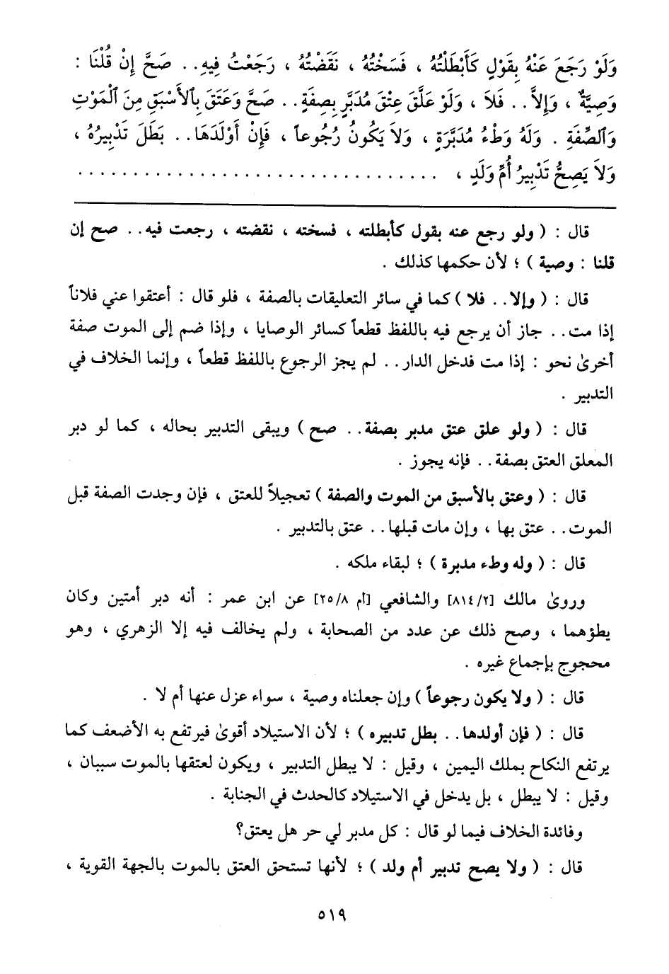 وَلَوْ رَجَعَ عَنْهُ بِقَوْلِ كَأَبْطَلْتُهُ، فَسَخْتُهُ، نَقَضْتُهُ، رَجَعْتُ فِيهِ .. صَحَّ إِنْ قُلْنَا: وَصِيَّةٌ، وَإِلَّا .. فَلَا، وَلَوْ عَلَّقَ عِتْقَ مُدَبَّرٍ بِصِفَةٍ .. صَحَّ وَعَتَقَ بِالأَسْبَقِ مِنَ الْمَوْتِ وَالصِّفَةِ، وَلَهُ وَطْءُ مُدَبَّرَةٍ، وَلَا يَكُونُ رُجُوعًا، فَإِنْ أَوْلَدَهَا .. بَطَلَ تَدْيِيرُهُ، وَلَا يَصِحُّ تَدْبِيرُ أُمِّ وَلَدٍ،