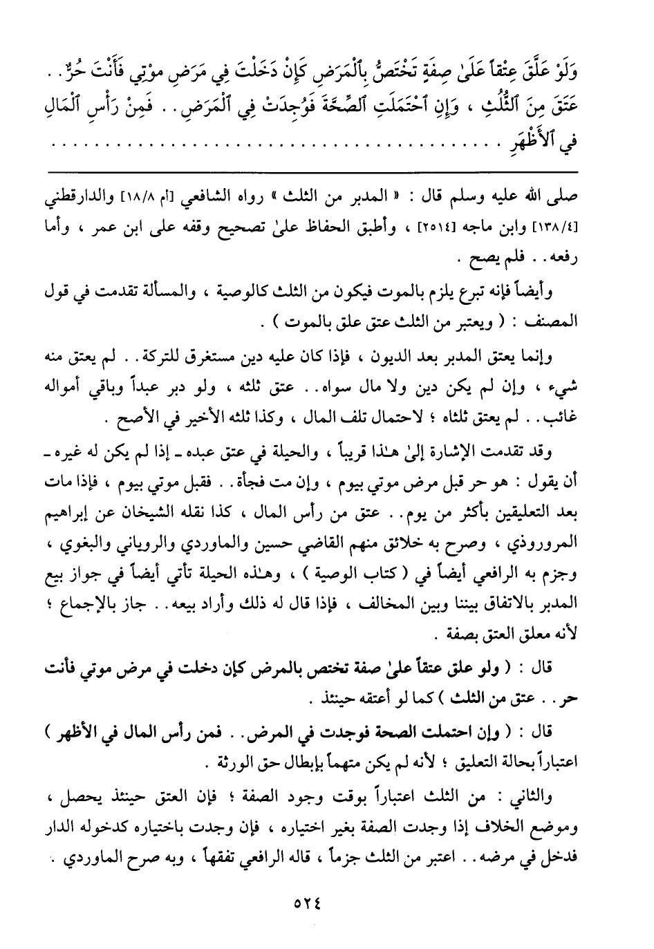 صلى الله عليه وسلم قال: (المدبر من الثلث) رواه الشافعي [أم 8/ 18] والدارقطني [4/ 138] وابن ماجه [2514] , وأطبق الحفاظ على تصحيح وقفه على ابن عمر, وأما رفعه .. فلم يصح.