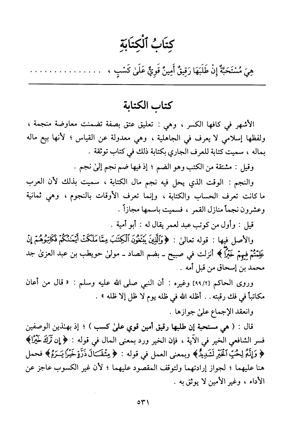 والأصل فيها: قوله تعالى: {والَّذِينَ يَبْتَغُونَ الكِتَابَ مِمَّا مَلَكَتْ أَيْمَانُكُمْ فَكَاتِبُوهُمْ إنْ عَلِمْتُمْ فِيهِمْ خَيْرًا} أنزلت في صبيح - بضم الصاد - مولى حويطب بن عبد العزى جد محمد بن إسحاق من قبل أمه.