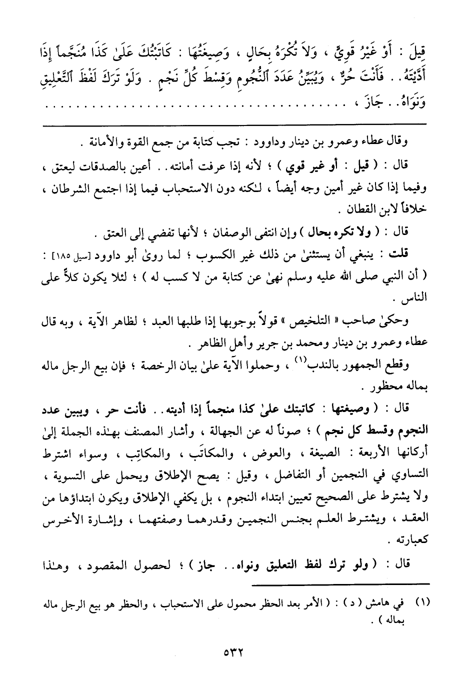 قِيلَ: أَوْ غَيْرُ قَوِيٍّ, وَلَا تُكْرَهُ بِحَالٍ, وَصِيغَتُهَا: كَاتَبْتُكَ عَلَى كَذَا مُنْجِّمًا إِذَا أَدَّيْتَهُ .. فَأَنْتَ حُرٌّ, وَيُبَيِّنُ عَدَدَ النُّجُومِ وَقِسْطَ كُلِّ نَجْمٍ. وَلَوْ تَرَكَ لَفْظَ التَّعْليِقِ ِوَنَوَاهُ .. جَازَ,