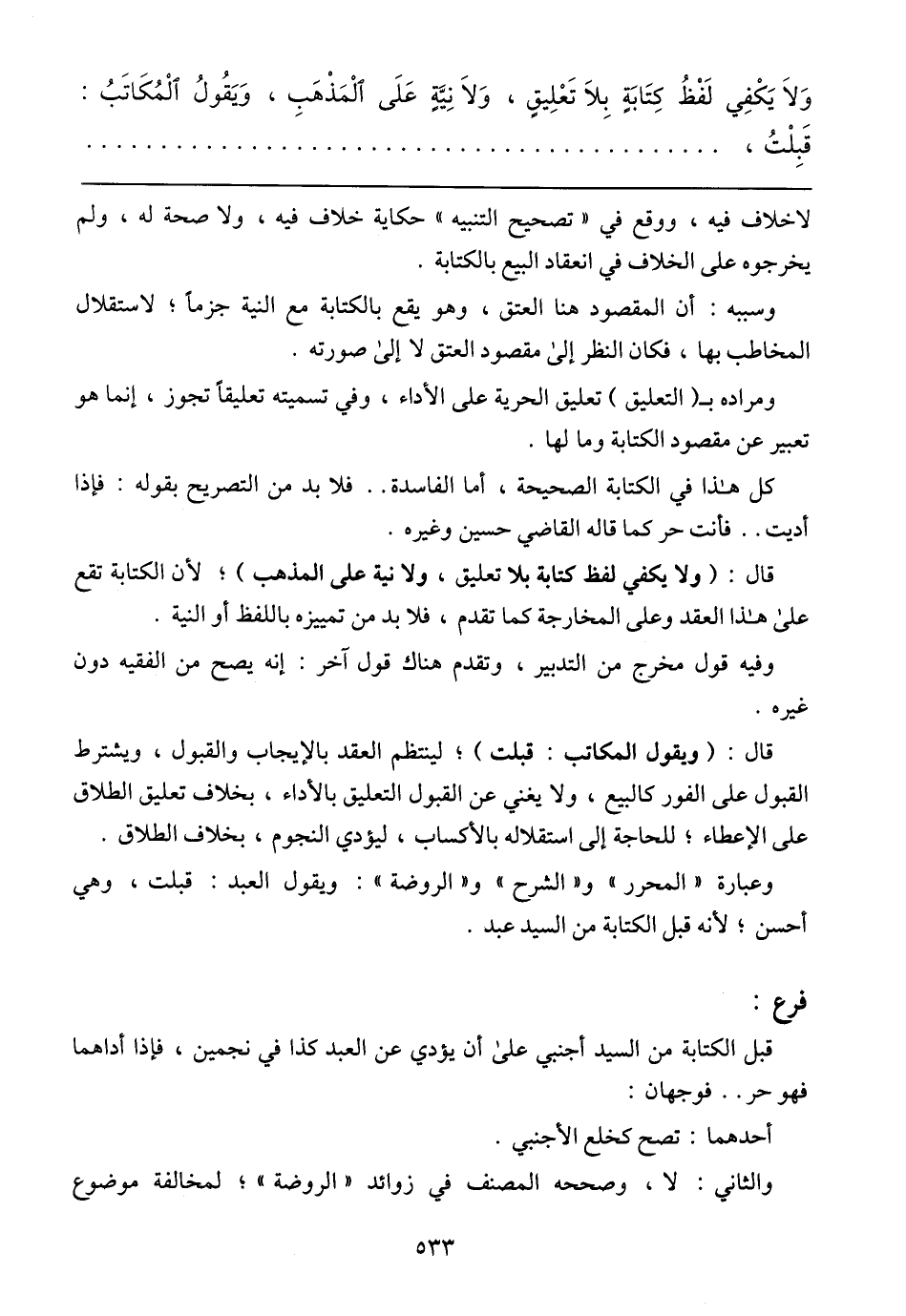 قال: (ويقول المكاتب: قبلت)؛ لينتظم العقد بالإيجاب والقبول, ويشترط القبول على الفور كالبيع, ولا يغني عن القبول التعليق بالأداء, بخلاف تعليق الطلاق على الإعطاء؛ للحاجة إلى استقلاله بالأكساب, ليؤدي النجوم, بخلاف الطلاق.