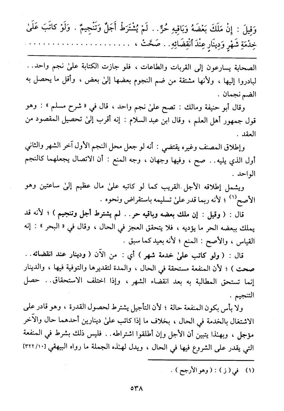 ولا بأس بكون المنفعة حالة, لأن التأجيل يشترط لحصول القدرة, وهو قادر على الاشتغال بالخدمة في الحال, بخلاف ما إذا كاتب على دينارين أحدهما حال والآخر مؤجل, وبهذا يتبين أن الأجل وإن أطلقوا اشتراطه .. فليس ذلك بشرط في المنفعة التي يقدر على الشروع فيها في الحال, ويدل لهذه الجملة ما رواه البيهقي [10/ 322]