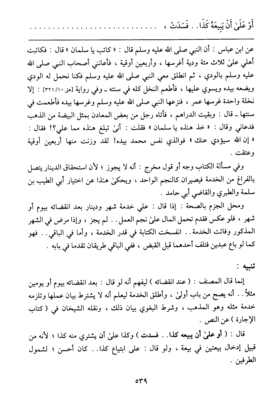 عن ابن عباس: أن النبي صلى الله عليه وسلم قال: (كاتب يا سلمان) قال: فكاتبت أهلي على ثلاث مئة ودية أغرسها, وأربعين أوقية, فأعانني أصحاب النبي صلى الله عليه وسلم بالودي, ثم انطلق معي النبي صلى الله عليه وسلم فكنا نحمل له الودي ويضعه بيده ويسوي عليها, فأطعم النخل كله في سنته – وفي رواية [هق 10/ 321]: إلا نخلة واحدة غرسها عمر, فنزعها النبي صلى الله عليه وسلم وغرسها بيده فأطعمت في سنتها – فال: وبقيت الدراهم, فأتاه رجل من بعض المعادن بمثل البيضة من الذهب فدعاني وقال: (خذ هذه يا سلمان) فقل،: أنى تبلغ هذه مما علي؟! فقال: (إن الله سيؤدي عنك) فوالذي نفس محمد بيده! لقد وزنت منها أربعين أوقية وعتقت.