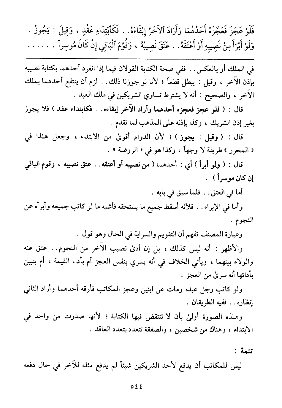 والأظهر: أنه ليس كذلك, بل إن أدى نصيب الآخر من النجوم .. عتق عنه والولاء بينهما, ويأتي الخلاف في أنه يسري بنفس العجز أم بأداء القيمة, أم يتبين بأدائها أنه سرى من العجز.
