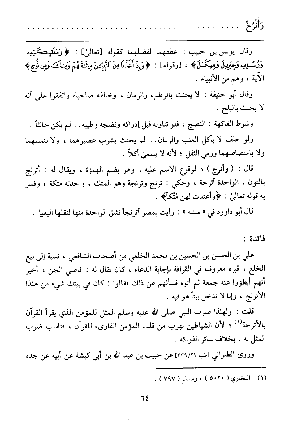 قلت: ولهذا ضرب النبي صلى الله عليه وسلم المثل للمؤمن الذي يقرأ القرآن بالأترجة؛ لأن الشياطين تهرب من قلب المؤمن القارئ للقرآن، فناسب ضرب المثل به، بخلاف سائر الفواكه.