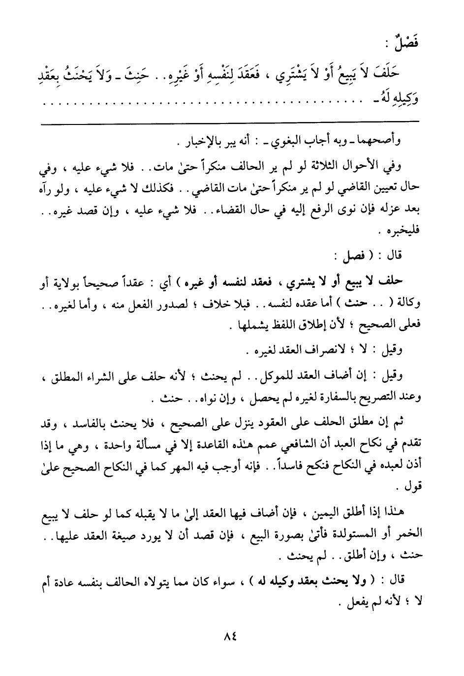 حلف لا يبيع او لا يشتري، فعقد لنفسه أو لغيره) أي: عقدًا صحيحًا بولاية أو وكالة (.. حنث) أما عقده لنفسه .. فبلا خلاف؛ لصدور الفعل منه، وأما لغيره .. فعلى الصحيح؛ لأن إطلاق اللفظ يشملها.