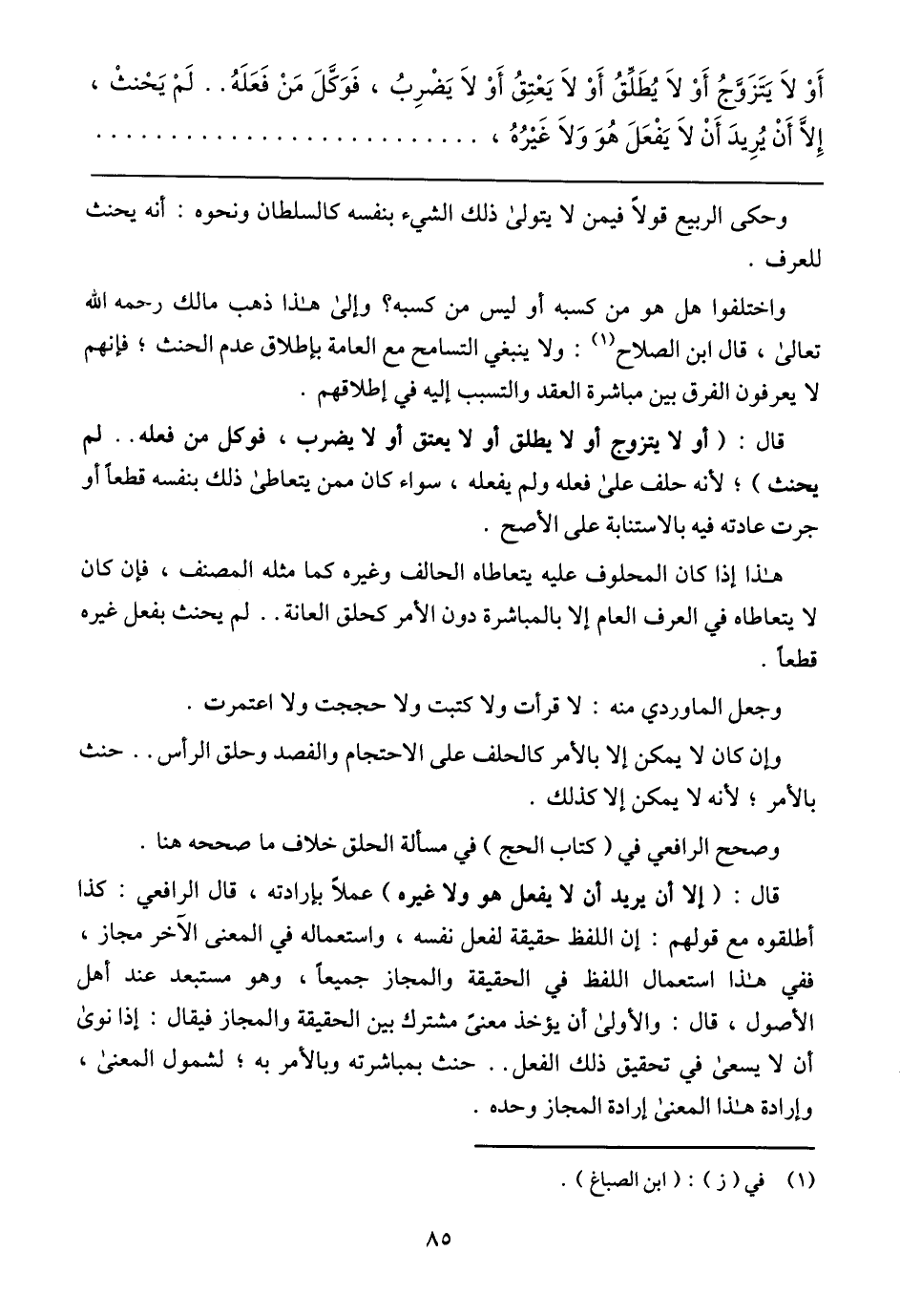 واختلفوا هل هو من كسبه او ليس من كسبه؟ وإلى هذا ذهب مالك رحمه الله تعالى، قال ابن الصلاح: ولا ينبغي التسامح مع العامة بإطلاق عدم الحنث؛ فإنهم لا يعرفون الفرق بين مباشرة العقد والتسبب إليه في إطلاقهم.