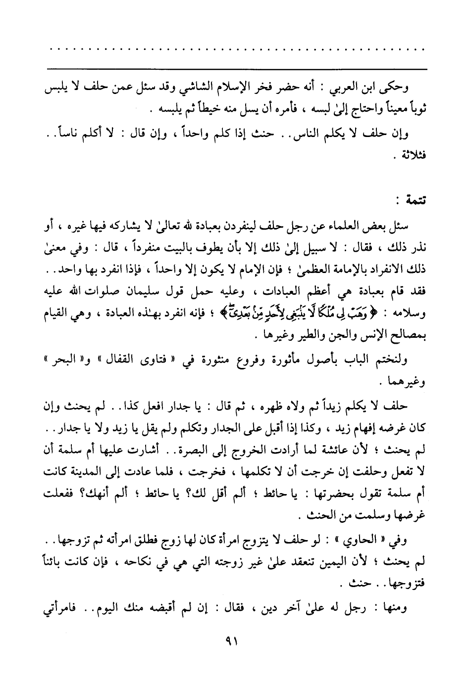وحكى ابن العربي: أنه حضر فخر الإسلام الشاشي عمن حلف لا يلبس ثوبًا معينًا واحتاج إلى لبسه، فأمره أن يسل منه خيطً ثم يلبسه.