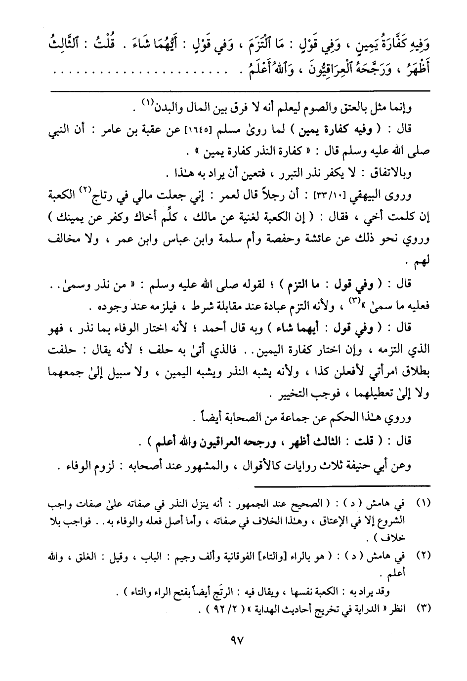 وبالاتفاق: لا يكفر نذر التبرر، فتعين أن يراد به هذا.