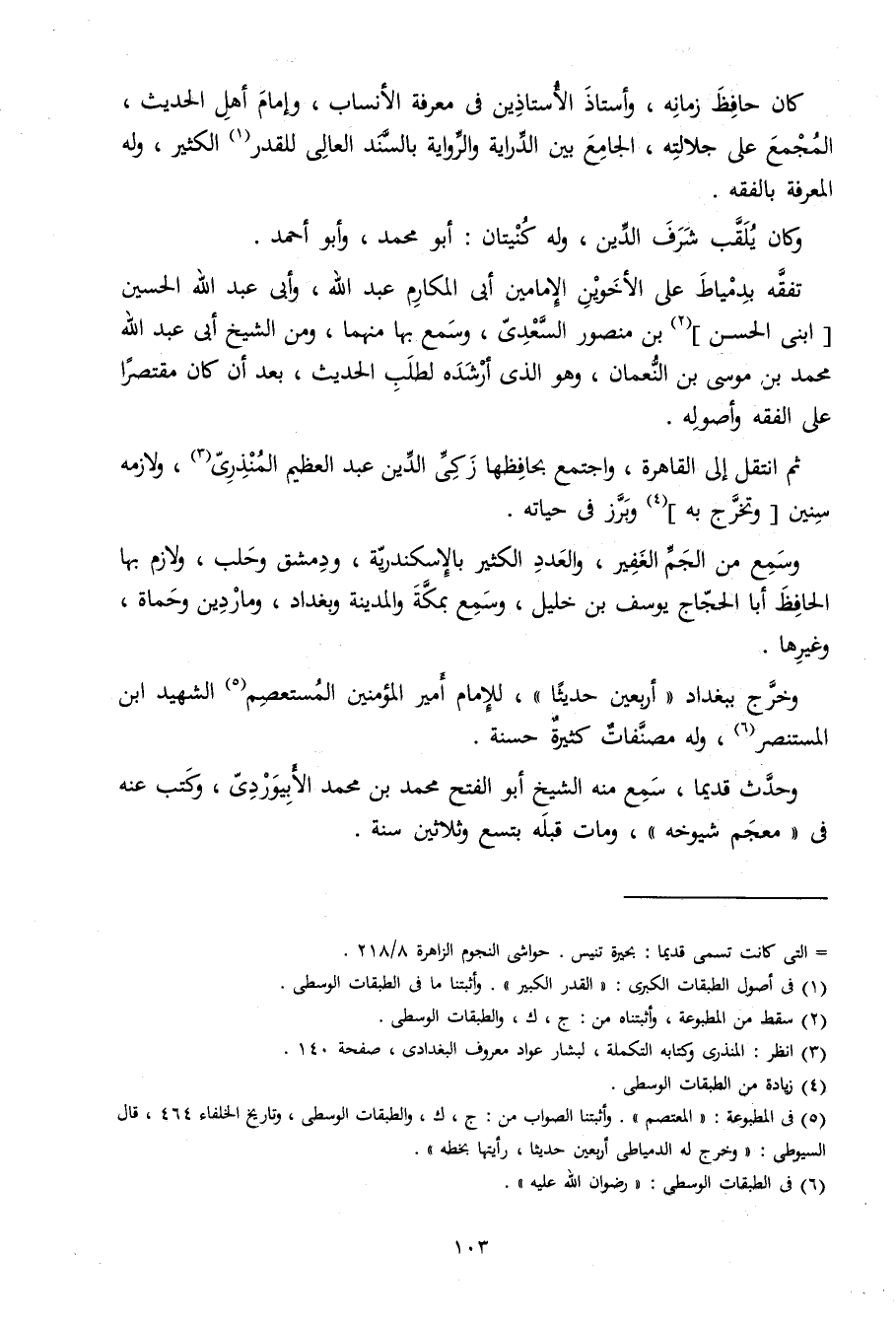 وَخرج بِبَغْدَاد أَرْبَعِينَ حَدِيثا للْإِمَام أَمِير الْمُؤمنِينَ المستعصم الشَّهِيد ابْن الْمُسْتَنْصر وَله مصنفات كَثِيرَة حَسَنَة