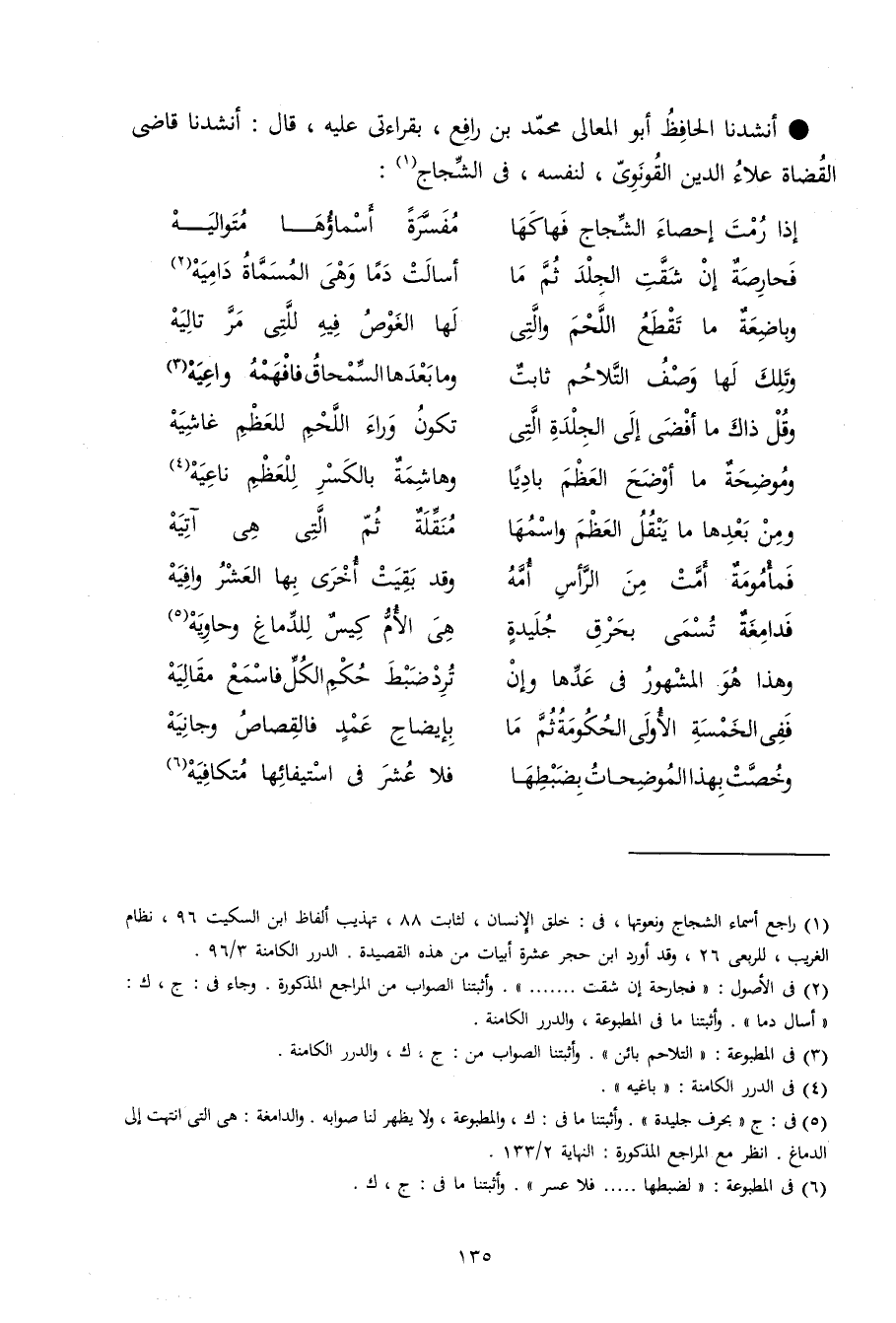 أنشدنا الْحَافِظ أَبُو الْمَعَالِي مُحَمَّد بن رَافع بِقِرَاءَتِي عَلَيْهِ قَالَ أنشدنا قَاضِي الْقُضَاة عَلَاء الدّين القونوي لنَفسِهِ فِي الشجاج