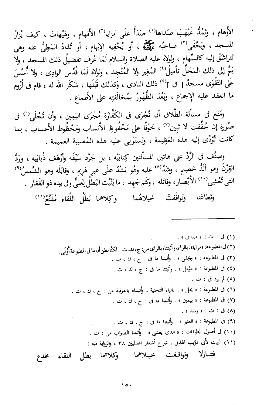 الأوهام وتمد غيهب صداها صدأ على مزايا الأفهام وهيهات كَيفَ يزار الْمَسْجِد وَيخْفى صَاحبه صلى الله عَلَيْهِ وَسلم أَو يخفيه الْإِبْهَام أَو تذاد الْمطِي عَنهُ وَهِي تتراشق إِلَيْهِ كالسهام ولولاه صلى الله عَلَيْهِ وَسلم لما عرف تَفْضِيل ذَلِك الْمَسْجِد وَلَا يم إِلَى ذَلِك الْمحل تأميل المغير وَلَا المنجد ولولاه لما قدس الْوَادي وَلَا أسس على التَّقْوَى مَسْجِد فِي ذَلِك النادي وَكَذَلِكَ قبلهَا شكر الله لَهُ قَامَ فِي لُزُوم مَا انْعَقَد عَلَيْهِ الْإِجْمَاع وَبعد الظُّهُور بمخالفته على الأطماع