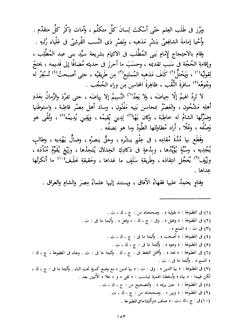 وَقَامَ بالاحتجاج لإِمَام بني الْمطلب فِي الائتمام بشريعة سيد بني عبد الْمطلب وَإِقَامَة الْحجَّة فِي سَبَب تَقْدِيمه وَحسب مَا أحرز فِي حَدِيثه مُضَافا إِلَى قديمه يحْتَج لقوليه ويحتل كنف مذْهبه الْمُمْتَنع من طريقيه حَتَّى أَصبَحت تسفر لَهُ وجوهه سافرة النقب ضاهرة المحاسن من وَرَاء الْحجب