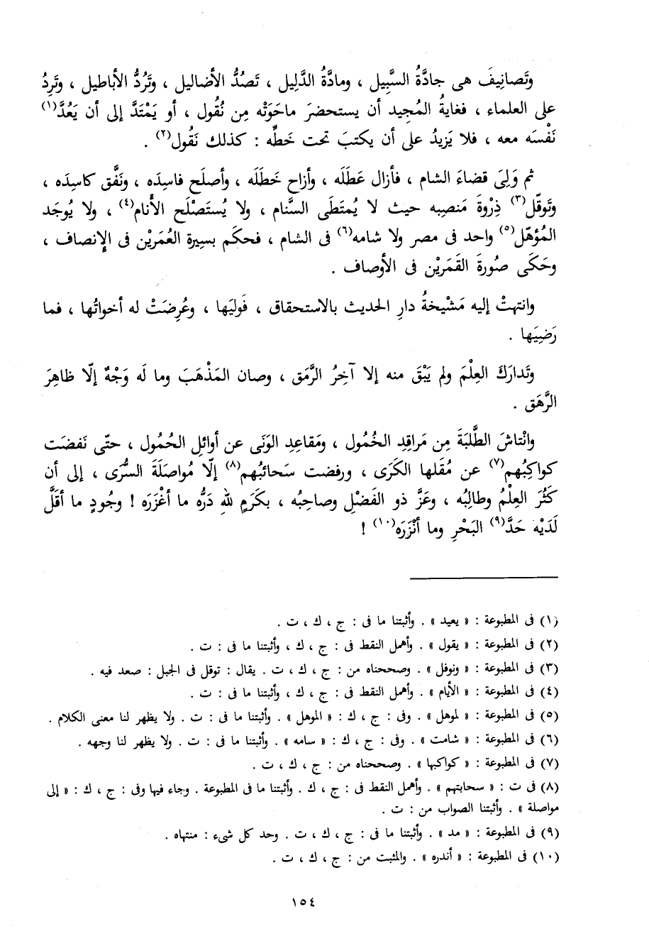 وتصانيف هِيَ جادة السَّبِيل ومادة الدَّلِيل تصد الأضاليل وَترد الأباطيل وَترد على الْعلمَاء فغاية الْمجِيد أَن يستحضر مَا حوته من نقُول أَو يَمْتَد إِلَى أَن يعد نَفسه مَعَه فَلَا يزِيد على أَن يكْتب تَحت خطه كَذَلِك نقُول