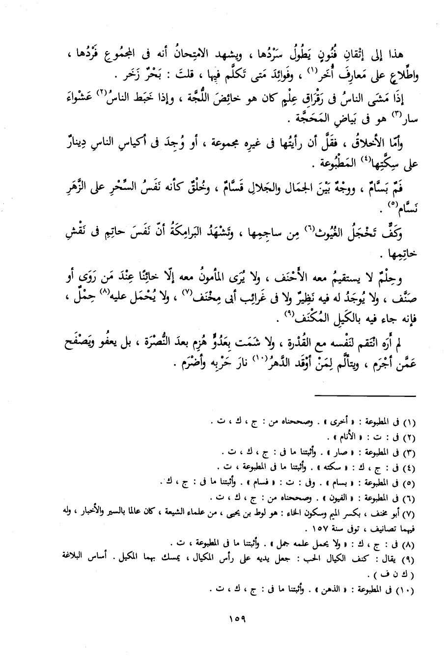 وحلم لَا يَسْتَقِيم مَعَه الْأَحْنَف وَلَا يرى الْمَأْمُون مَعَه إِلَّا خائنا عِنْد من روى أَو صنف وَلَا يُوجد لَهُ فِيهِ نَظِير وَلَا فِي غرائب أبي مخنف وَلَا يحمل عَلَيْهِ حمل فَإِنَّهُ جَاءَ فِيهِ بِالْكَيْلِ المكنف