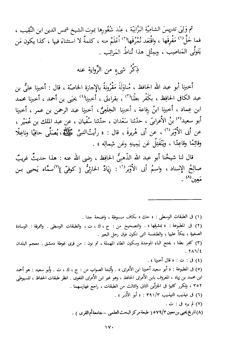 أخبرنَا أَبُو عبد الله الْحَافِظ مناولة مقرونة بِالْإِجَازَةِ الْخَاصَّة قَالَ أخبرنَا عَليّ بن عبد الْكَافِي الْحَافِظ بِكفْر بَطنا بِقِرَاءَتِي أخبرنَا يحيى بن أَحْمد أخبرنَا مُحَمَّد ابْن عماد أخبرنَا ابْن رِفَاعَة أخبرنَا الخلعي أخبرنَا عبد الرَّحْمَن بن عمر أخبرنَا أَبُو سعيد بن الْأَعرَابِي حَدثنَا سَعْدَان حَدثنَا سُفْيَان عَن عبد الْملك بن عُمَيْر عَن أبي الأوبر عَن أبي هُرَيْرَة قَالَ رَأَيْت النَّبِي صلى الله عَلَيْهِ وَسلم يُصَلِّي حافيا وناعلا وَقَائِمًا وَقَاعِدا وينفتل عَن يَمِينه وَعَن شِمَاله