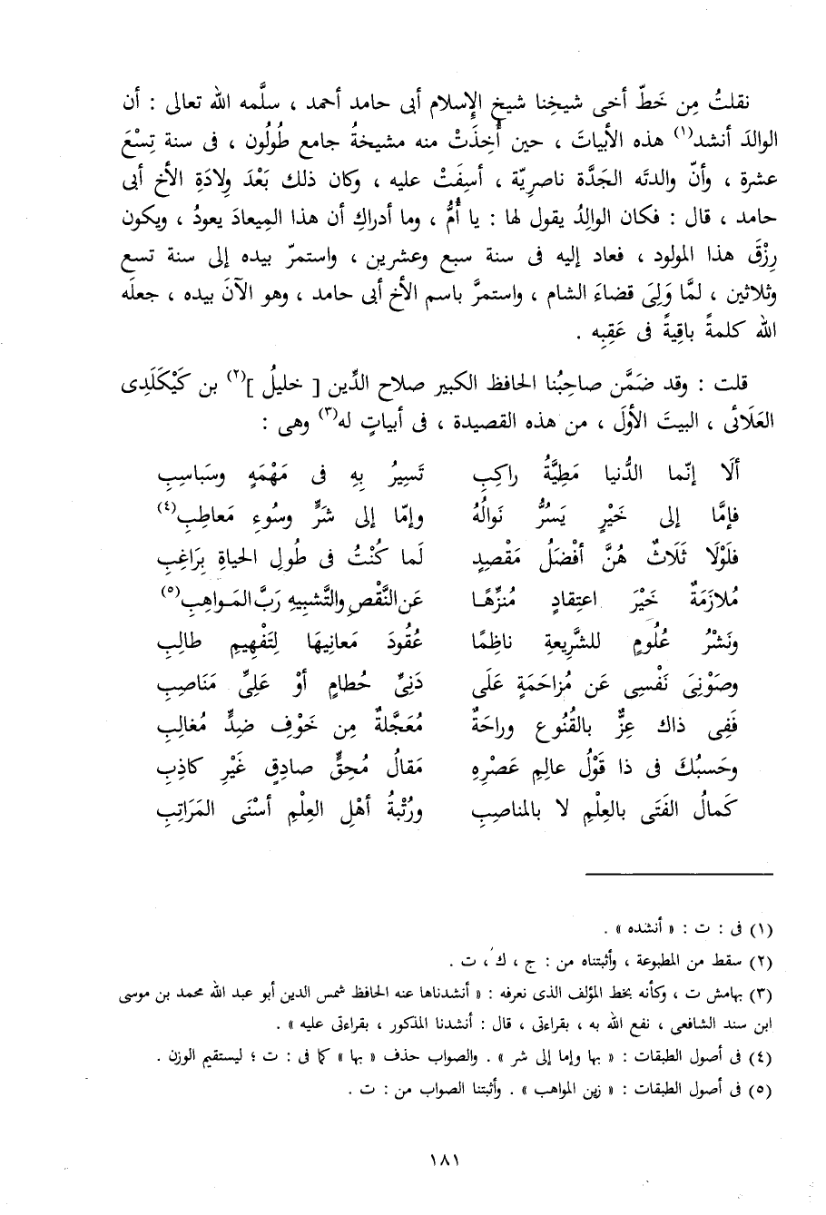 قلت وَقد ضمن صاحبنا الْحَافِظ الْكَبِير صَلَاح الدّين خَلِيل بن كيكلدي العلائي الْبَيْت الأول من هَذِه القصيدة فِي أَبْيَات لَهُ وَهِي