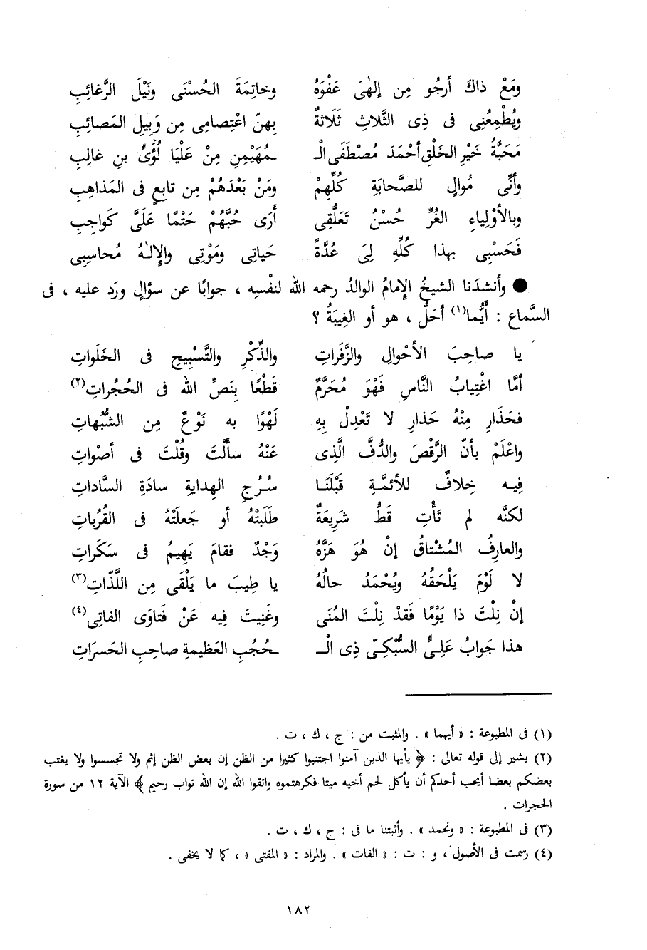 وأنشدنا الشَّيْخ الإِمَام الْوَالِد رَحمَه لله لنَفسِهِ جَوَابا عَن سُؤال ورد عَلَيْهِ فِي السماع أَيّمَا أحل هُوَ أَو الْغَيْبَة