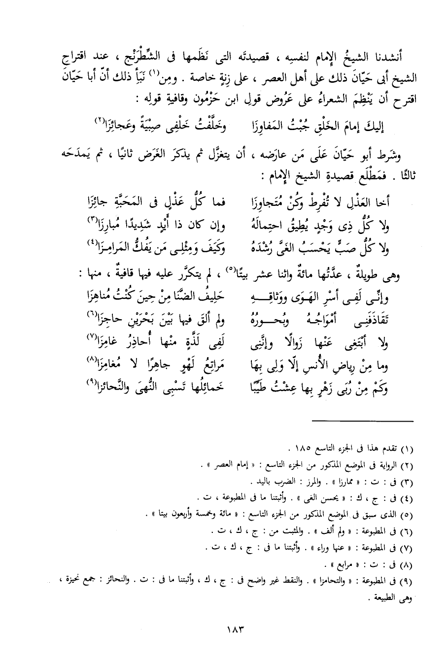 وَشرط أَبُو حَيَّان على من عَارضه أَن يتغزل ثمَّ يذكر الْغَرَض ثَانِيًا ثمَّ يمدحه ثَالِثا