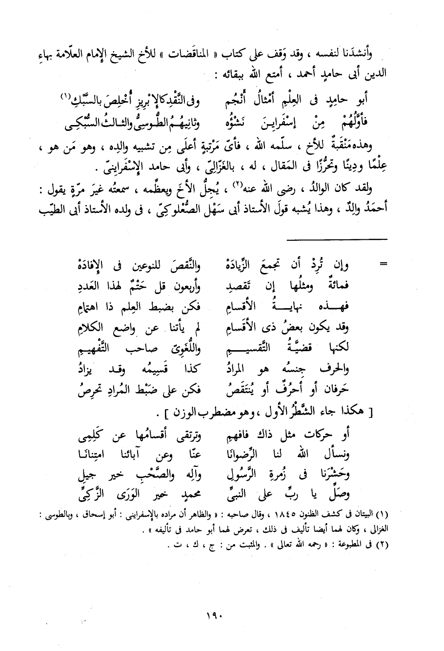 وأنشدنا لنَفسِهِ وَقد وقف على كتاب المناقضات للْأَخ الشَّيْخ الإِمَام الْعَلامَة بهاء الدّين أبي حَامِد أَحْمد أمتع الله بِبَقَائِهِ