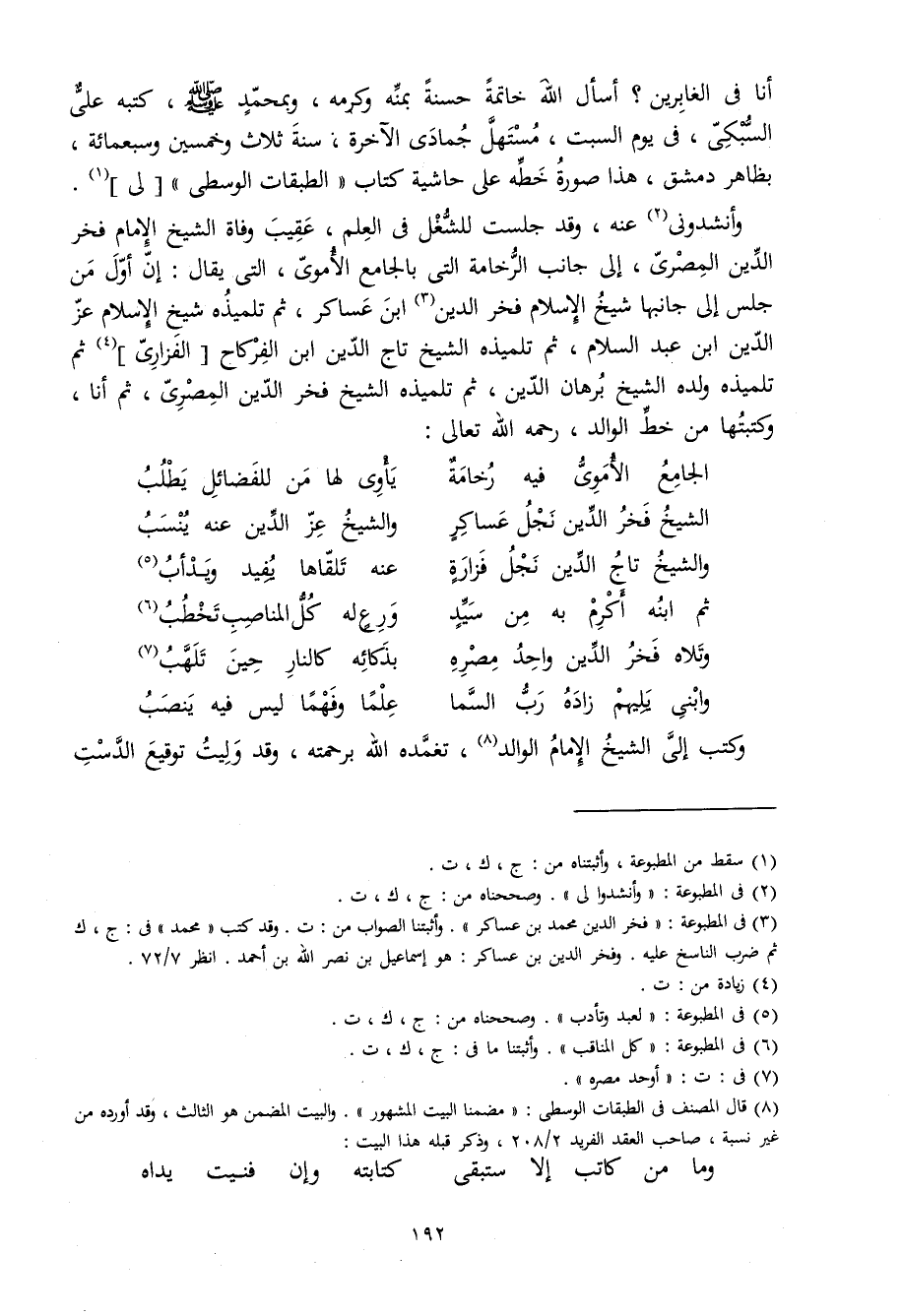 وأنشدوني عَنهُ وَقد جَلَست للشغل فِي الْعلم عقيب وَفَاة الشَّيْخ الإِمَام فَخر الدّين الْمصْرِيّ إِلَى جَانب الرخامة الَّتِي بالجامع الْأمَوِي الَّتِي يُقَال إِن أول من جلس إِلَى جَانبهَا شيخ الْإِسْلَام فَخر الدّين ابْن عَسَاكِر ثمَّ تِلْمِيذه شيخ الْإِسْلَام عز الدّين ابْن عبد السَّلَام ثمَّ تِلْمِيذه الشَّيْخ تَاج الدّين ابْن الفركاح الْفَزارِيّ ثمَّ تِلْمِيذه وَلَده الشَّيْخ برهَان الدّين ثمَّ تِلْمِيذه الشَّيْخ فَخر الدّين الْمصْرِيّ ثمَّ أَنا وكتبتها من خطّ الْوَالِد رَحمَه الله تَعَالَى