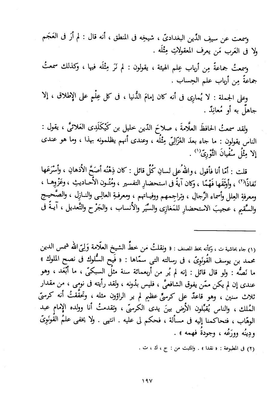 وَسمعت عَن سيف الدّين الْبَغْدَادِيّ شَيْخه فِي الْمنطق أَنه قَالَ لم أر فِي الْعَجم وَلَا فِي الْعَرَب من يعرف المعقولات مثله
