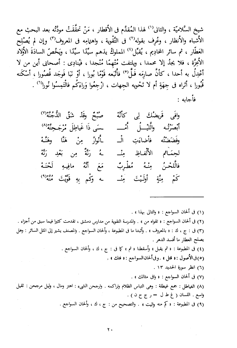 شيخ السلامية وَالثَّانِي لهَذَا الْمُقدم فِي الأقطار من تحققت مودته بعد الْبَحْث مَعَ الْأَشْبَاه والأنظار وَعرف بقوله فِي التقوية واهتمامه فِي الْمَعْرُوف وَإِن لم يصلح الْعَطَّار ثمَّ سَائِر المخاديم يقبل الْمَمْلُوك يدهم سيدا سيدا ويخص السَّادة الْأَوْلَاد الأعزة فَلَا يجد إِلَّا مُحَمَّدًا ويلتفت مُتَّهمًا منجدا فينادي أَصْحَابِي أَيْن من لَا أعدل بِهِ أحدا كَأَن صارمه فل فَأتبعهُ قوما بورا أَو نبا فَوجدَ قصورا أسْكنهُ قبورا أتراه فِي جِهَة أم لَا تحويه الْجِهَات ارْجعُوا وراءكم فالتمسوا نورا