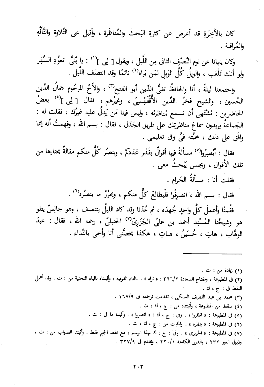 فقمنا وأعمل كل وَاحِد جهده ثمَّ عدنا وَقد كَاد اللَّيْل ينتصف وَهُوَ جَالس يَتْلُو هُوَ وَشَيخنَا الْمسند أَحْمد بن عَليّ الْجَزرِي الْحَنْبَلِيّ رَحمَه الله فَقَالَ عبد الْوَهَّاب هَات حُسَيْن هَات هَكَذَا يخصني أَنا وَأخي بالنداء
